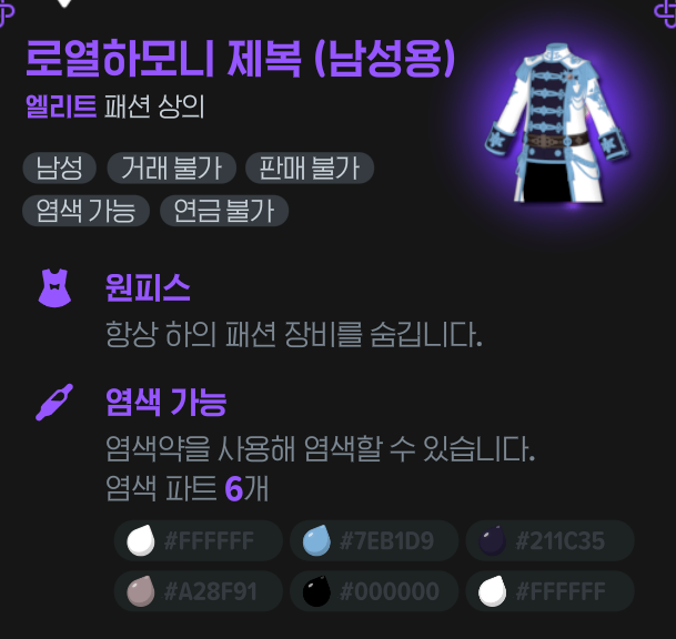 로열하모니 캡, 로열하모니 제복, 로열하모니 글러브, 로열하모니 부츠 (남성용)